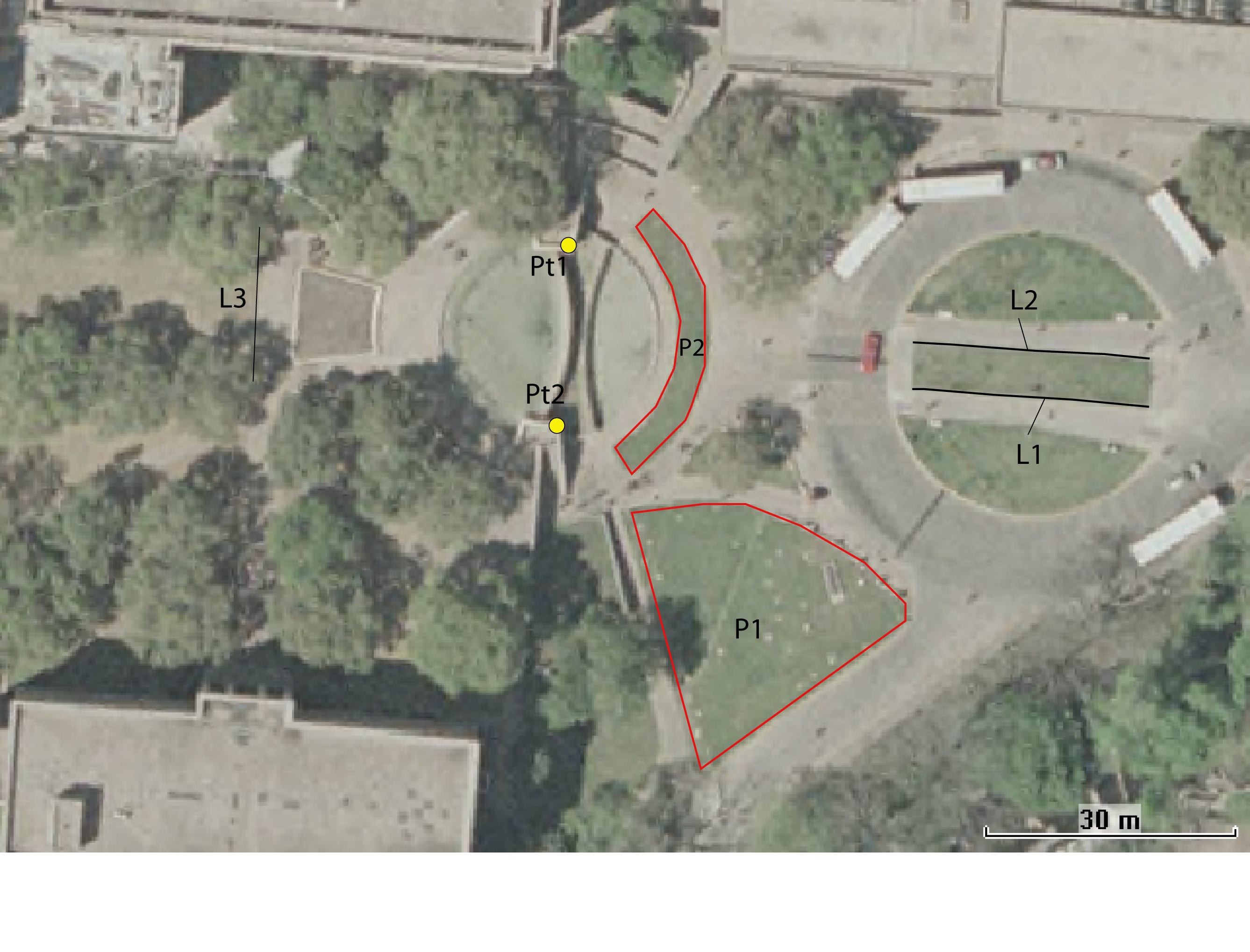 - P1, P2: Polygons outlining grass areas - capture the vertices with
