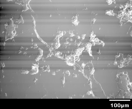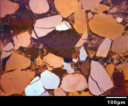 Color CL and SEI views of the same area. An ankerite-filled microfracture cuts diagonally across this sample from RGB3932.5, it is not necessary to use the CL to see it. However, there are a couple of smaller microfractures parallel to the larger one that are quartz-lined and are not visible in SEI mode. There are also a number of other quartz-lined fractures that are not parallel to the main fracture.