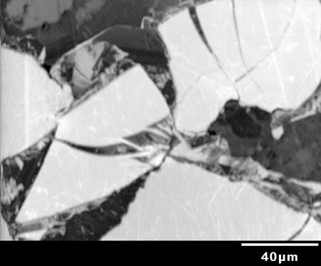 Panchromatic grayscale CL image. A close-up showing Category II (compactional) microfractures in the sample. These fractures are lined with quartz. The wedge-shaped and curved traces are typical of Category II microfractures and suggest a rotational component to fracturing.